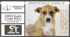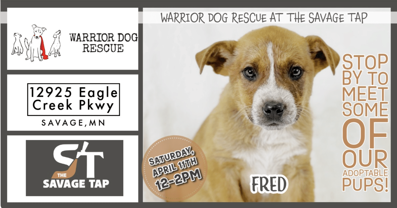 Adoption Event at Savage Tap Stop by Saturday April 11th from 12-2pm at Savage Tap to meet some adoptable dogs and learn more about WDR! Can’t wait to see you there! + Add to Google Calendar + iCal / Outlook export Date Apr 11 2026 Expired! Time 12:00 pm - 2:00 pm Location The Savage Tap 12925 Eagle Creek Parkway Savage, MN Share this event