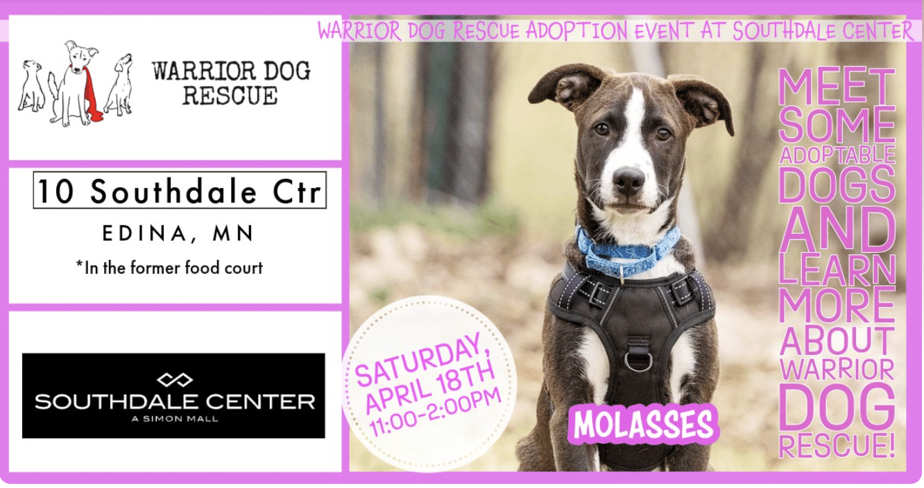 Adoption Event at Southdale Center Join us at Southdale Center on Saturday April 18th from 11-2pm to meet some adoptable dogs! Can’t wait to see you there! + Add to Google Calendar + iCal / Outlook export 00 days 00 hours 00 minutes 00 seconds Date Apr 18 2026 Time 11:00 am - 2:00 pm Location Southdale Center 10 Southdale Center Edina, MN 55435 Share this event