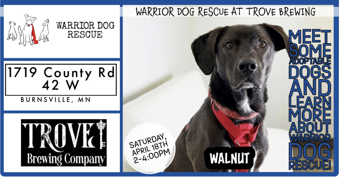 Adoption Event at Trove Brewing Join us at Trove Brewing on Saturday April 18th from 2-4pm to meet some adoptable dogs!Can’t wait to see you there! + Add to Google Calendar + iCal / Outlook export 00 days 00 hours 00 minutes 00 seconds Date Apr 18 2026 Time 2:00 pm - 4:00 pm Location Trove Brewing Co. 1719 Co Rd 42 West Burnsville, MN Share this event