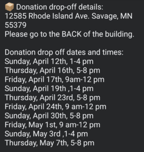 Donation Drop off for Garage Sale + Add to Google Calendar + iCal / Outlook export 00 days 00 hours 00 minutes 00 seconds Date Apr 16 2026 Time 5:00 pm - 8:00 pm Location The Dog House 12585 Rhode Island Avenue Savage, MN Share this event